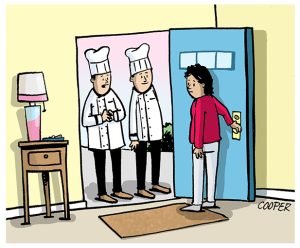 Hello Caption Contest fans! Lawrence Wood is off enjoying the Irish coast and I’m filling in this week. Last month’s contest featured a drawing by cartoonist Nathan Cooper. Here we have a woman opening the door to two chefs and one is clearly speaking. The Chefs may be identical but clearly are visiting the woman…