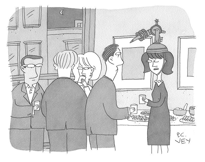 At P.C. Vey’s cocktail party, a woman standing by the buffet is holding a drink in her left hand and chatting with a man. On her head is a futuristic contraption (maybe a death-ray?) pointing at the man to whom she’s talking.