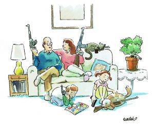 Because of this past weekend’s horrific mass shootings at Brown University in Rhode Island and at the Hanukkah celebration in Sydney, Australia, we came very close to pulling the following commentary on our 200th caption contest, which featured a drawing by New Yorker cartoonist Liam Francis Walsh. It’s set in a living room, where a nice-looking family is relaxing with their pets. Everyone (the father, mother, young son and daughter, and even the cat and dog and houseplant) is armed with an automatic rifle or handgun, and the dad is speaking.