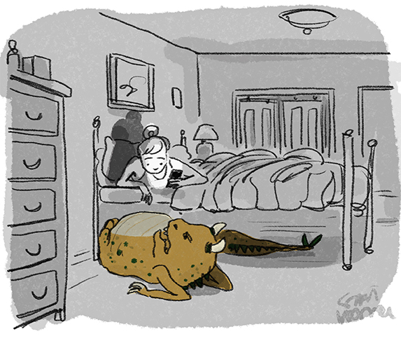 Last month’s contest featured a drawing by New Yorker cartoonist Sofia Warren, who unfortunately couldn’t join our judging panel but did review all the entries and send us her top ten. Sofia’s drawing is set in a bedroom, where a woman is in bed and on her smart phone. Under her bed is a monster, who’s leaning back on his elbows and saying something to the woman.