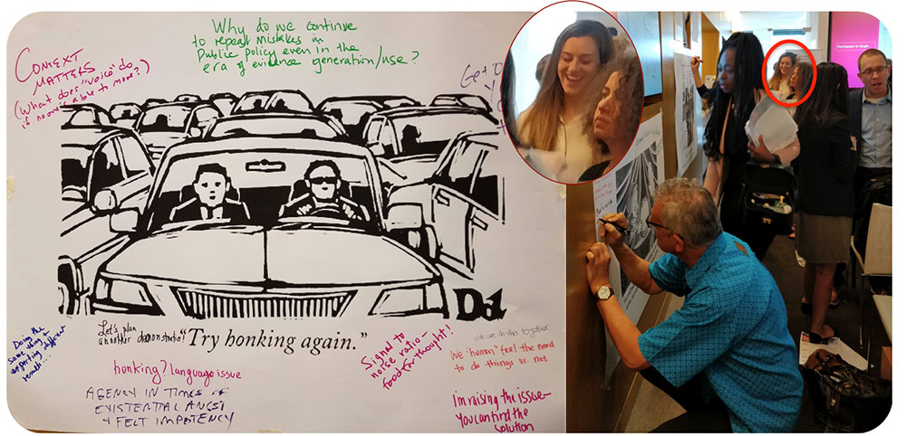 These cartoons, printed in poster size with ample space on the margins, enabled participants to annotate the cartoons with their reflections about their real-world challenges and opportunities.