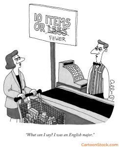 That first caption would be better id the word “how” were deleted and the words “less and less” were replaced with “fewer and fewer.” I know I’ll be accused of nitpicking, but improper grammar distracts from an otherwise funny joke. Use the word “fewer” for things you can count, like angels. J.C. Duffy made this rule the point of one of his best cartoons: