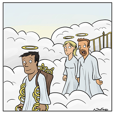 Last month’s contest featured a cartoon by Nate Fakes, who joined our judging panel. His drawing is set in heaven, where two angels are looking at another angel who’s carrying more than his fair share of halos and wearing a backpack that’s overflowing with them. One of the onlooker angels is addressing the other. Nate did not have a caption for this cartoon so he was humbled by the number of good ideas he saw among the more than 400 entries this contest elicited.